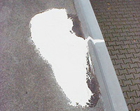 Das abzudichtende Bitumendach bzw. Schweißbahn- oder Pappdach muss für die Kunststoffbeschichtung trocken, sauber, silikon-, wachs- und fettfrei sein. Der Untergrund muss "tragfähig" gestaltet werden, d. h. hartnäckige Verschmutzungen, Ablagerungen (z. B. Moose, Flechten usw.) müssen ggf. mechanisch oder mit einem Hochdruckreiniger entfernt werden. In den meisten Fällen genügt jedoch das gründliche Abfegen der Bitumenoberfläche mit einem harten Besen.2. Das Vordichten der Risse sowie Nahtbereiche an ungleichen Materialien: